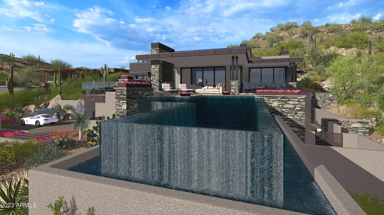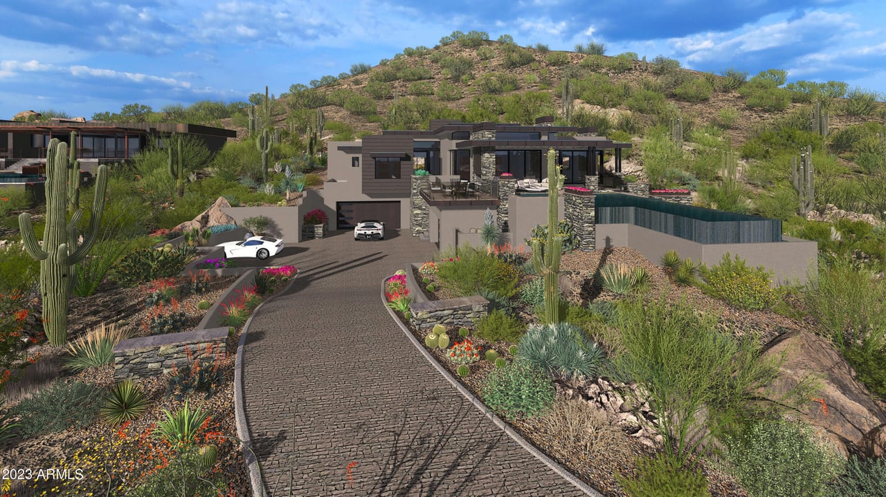 This stunning new design by Blackstone Development sits on one of the few elevated lots within guard gated Sincuidados. Gorgeous curb appeal from the start w/most amenities on the main level such as the great room, kitchen, master bedroom, & bedrooms 2 & 3 along with the beg edge pool/spa and generous outdoor living area. The street level features a 5 car garage for your auto enthusiasts, guest casita, study, & media room w/large bar for entertaining, & wine closet. Finishes will be designer chosen and coordinated to complete this turn key project that combines the finest in design and architecture w/fabulous mountain & city light views. Project is in the process of going through HOA design review along with the City of Scottsdale so hoping to have permits soon. Still time to customize.